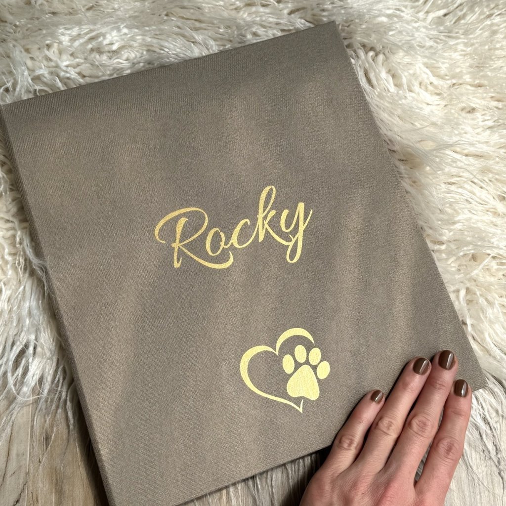 Elegantní plátěná obálka dodává albu jedinečnost a nadčasovost. A díky vlastnímu nápisu na obálce se stane skutečně vaším – můžete si nechat napsat jméno mazlíčka („Charlie“, „Micka“, „Beny“), nebo něco osobnějšího jako „Náš příběh“, „Tlapkové vzpomínky“, „Můj malý přítel“. Fantazii se meze nekladou – album může být pro pejska, kočku, morče, králíka i rybičku.