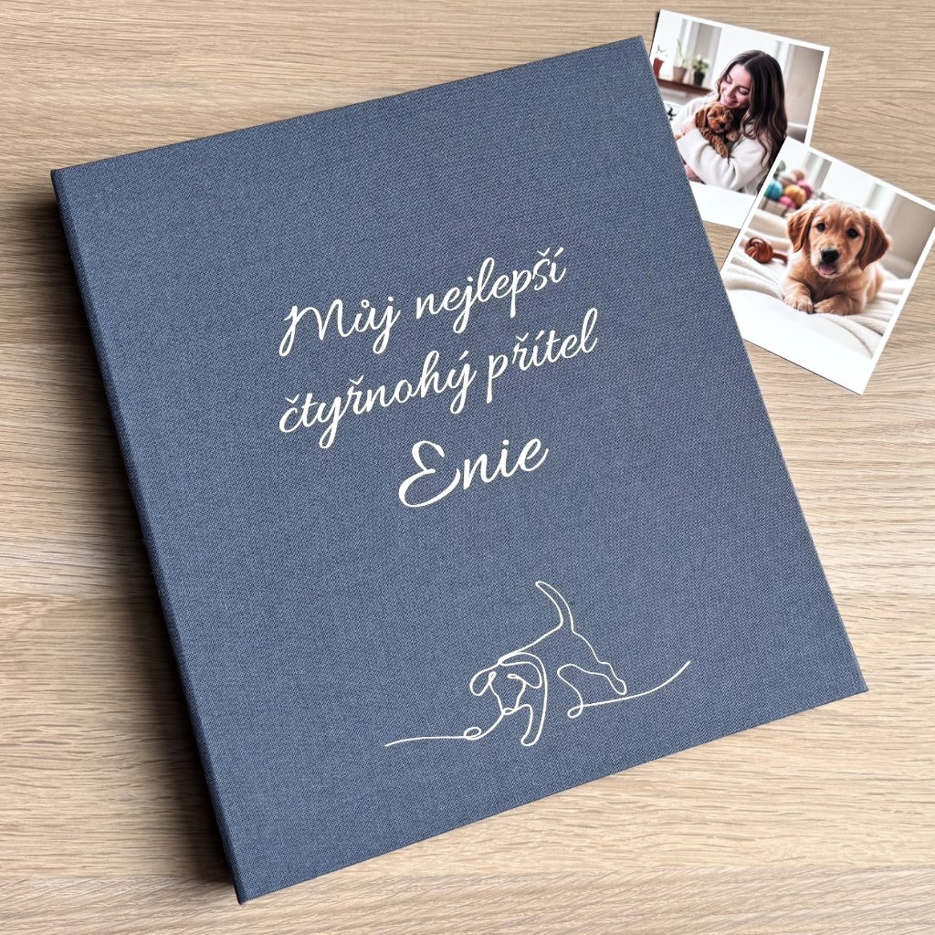 Elegantní plátěná obálka dodává albu jedinečnost a nadčasovost. A díky vlastnímu nápisu na obálce se stane skutečně vaším – můžete si nechat napsat jméno mazlíčka („Charlie“, „Micka“, „Beny“), nebo něco osobnějšího jako „Náš příběh“, „Tlapkové vzpomínky“, „Můj malý přítel“. Fantazii se meze nekladou – album může být pro pejska, kočku, morče, králíka i rybičku.
