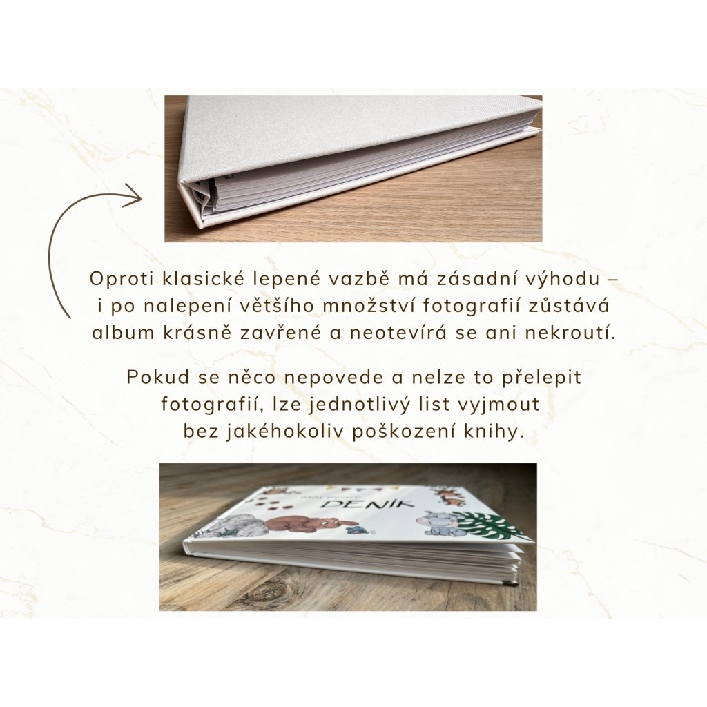 Luxusní plátěná obálka s možností přidání jména, data narození nebo vlastního nápisu a grafiky dodává knize osobitý charakter. Její nadčasová elegance ozdobí dětský pokoj i po mnoha letech. Věřím, že právě první roky života jsou plné barev, hravosti a něhy – a takové by mělo být i album, které je zachytí. A co je nejdůležitější – budete se k ní vracet po celý život a jednou ji předáte svému dítěti jako ten nejkrásnější dar z prvních let jeho života.